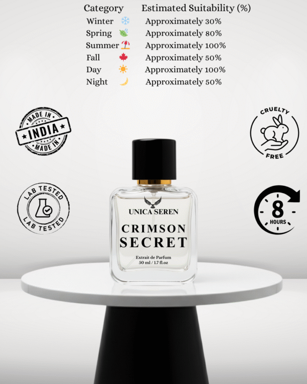 Crimson Secret is a vibrant, spicy, and commanding fragrance designed for maximum impact. As an Extrait de Parfum, it is highly concentrated to an exceptional 8+ hour projection and performance.