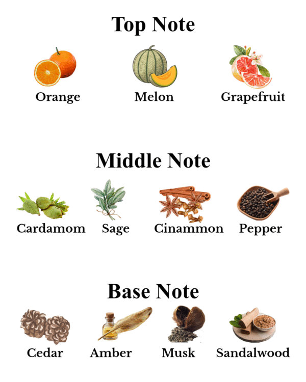 • The Secret Heart: A powerfully aromatic and warm core featuring exotic Cardamom, fresh Sage, and spiced Cinnamon and Pepper.